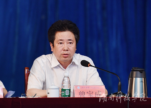 曾宝成在讲话中指出,回顾过去三年,学校在教学改革、人才培养等方面取得了可喜成绩,尤其是教师获得湖南省普通高校课堂教学竞赛三等奖以上奖励17人次,其中一等奖6人次,获奖等级和数量居同类院校前列;学生获得省级以上学科专业竞赛奖励130余项,其中获全国第四届大学生艺术展演一等奖和优秀创作奖、首届中国“互联网+”大学生创新创业大赛总决赛银奖等等。但在看到成绩的同时,我们也要清醒地认识到,当前我校教学工作中还存在一些薄弱环节,我们的任务依然艰巨,责任十分重大。当前,国家积极引导部分地方本科高校向应用型转变,深入推进高等教育供给侧结构性改革。面对这一重大发展机遇,学校要全面发力,将教学工作的中心地位落到实处,确保应用型人才培养质量。