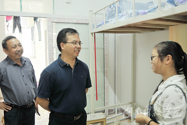 走访学生宿舍时,陈弘认真地询问新生们的情况。看见老师们进来,同学们赶紧围过来向老师问好,陈弘亲切地与同学们说:“同学之间要互相团结,积极向上,要吃好、睡好、学习好,加强锻炼身体。”环境艺术设计专业的大一新生董毅感慨,“陈书记真是一个十分亲切又关心学生的校领导,一定听陈书记的话,好好学习。”