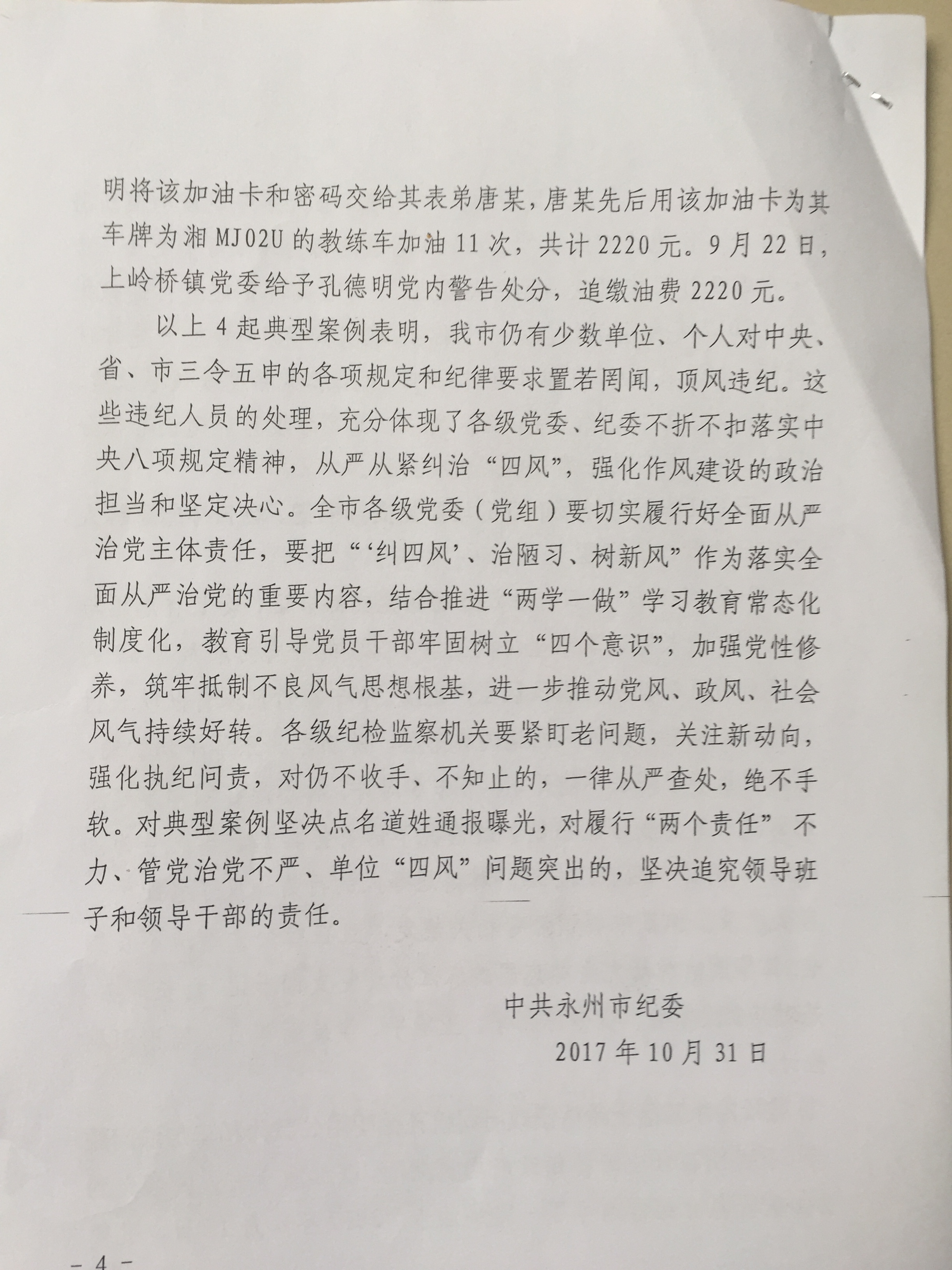 现将《中共永州市纪委关于4起违反作风建设规定典型案例通报》(永纪通〔2017〕27号)等4个文件转发给你们,请组织本单位教职员工认真学习,引以为戒。