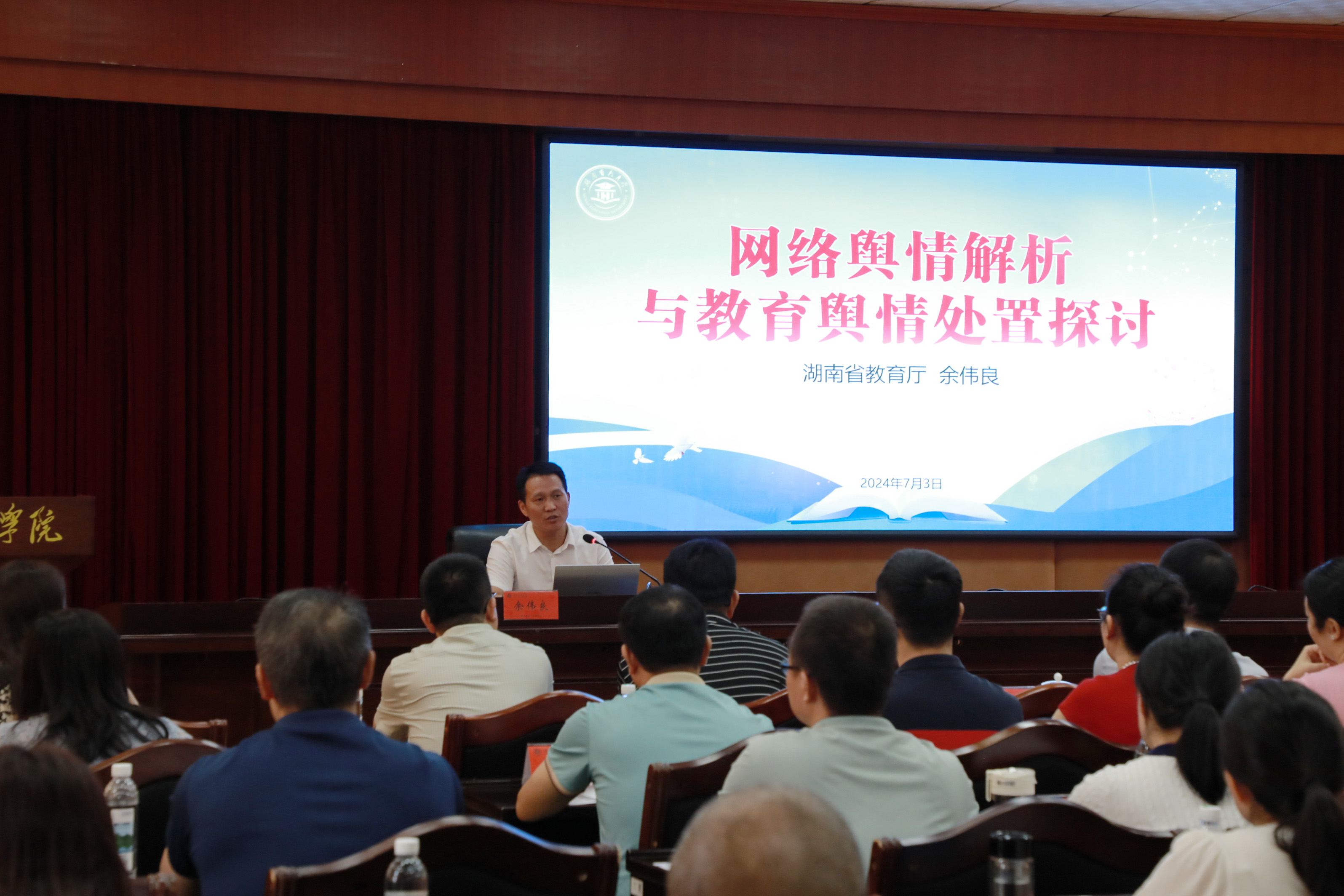 开班式后,湖南省委教育工委委员,省教育厅党组成员余伟良作首场专题辅导报告。培训班学员及我校各教学学院党总支副书记、新闻宣传专干到场聆听。