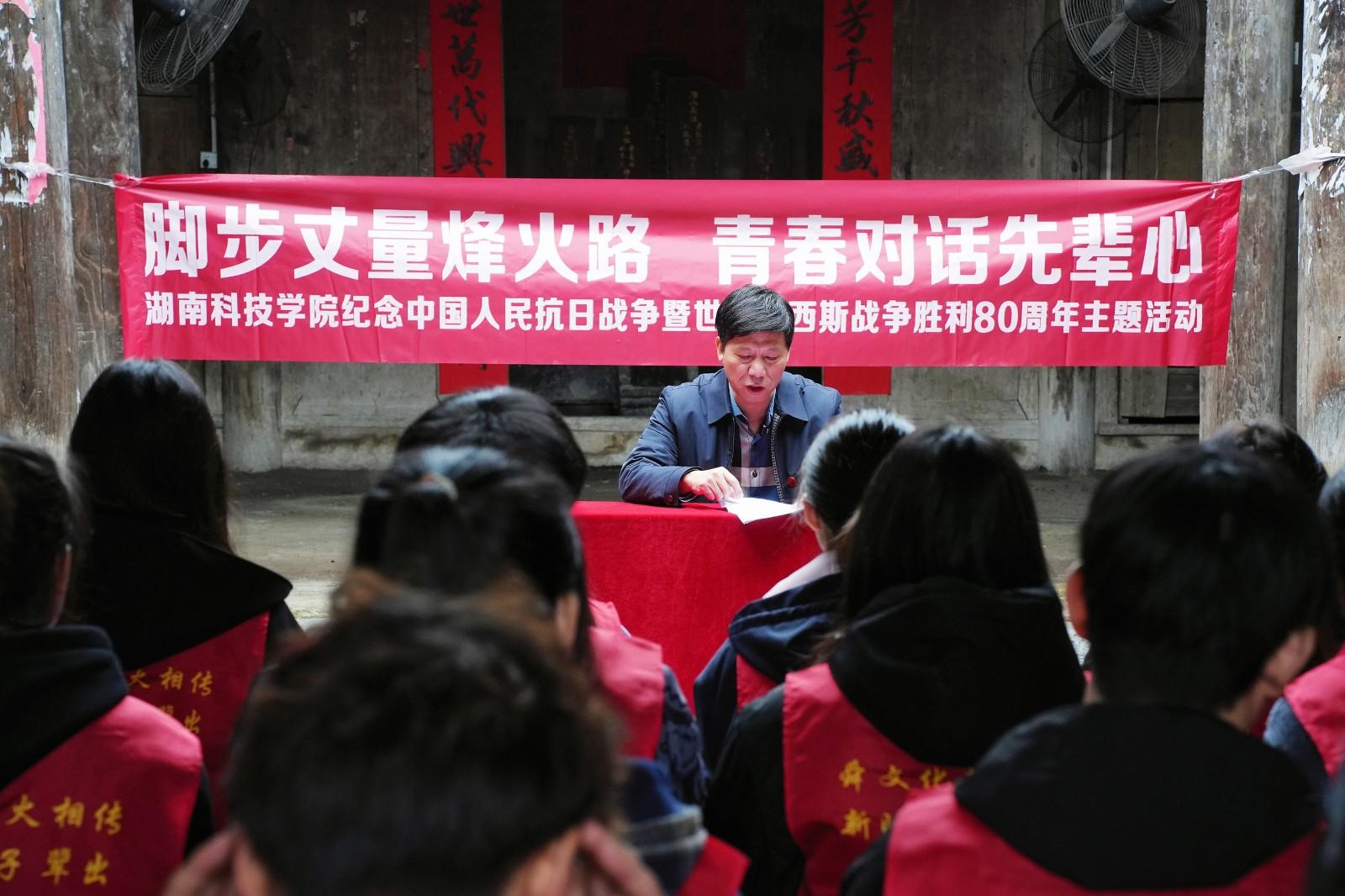 “我们学校四迁其址,七易其冠,1944年因日寇铁骑肆虐,为保存教育薪火,从道县迁至此地,不仅坚持正常教学,还积极开展抗日宣传,组织学生参与地方建设。”该校二级教授潘剑锋以学校旧址麦地村黄家宗祠为讲堂,向师生讲述了先辈们如何在战火中坚守教育事业的往事,介绍了从“湖南省立第七师范学校”到“开云(中国)Kaiyun·官方网站”的筚路蓝缕。