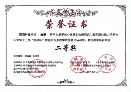 本网讯(通讯员 高海峡)9月6日,我院5名物理学子收到全国第十五届“格致杯”物理师范生教学技能展示与交流活动组委会发来的证书,其中教学展评“二等奖”2项,“三等奖”3项,自制教具“二等奖”1项。