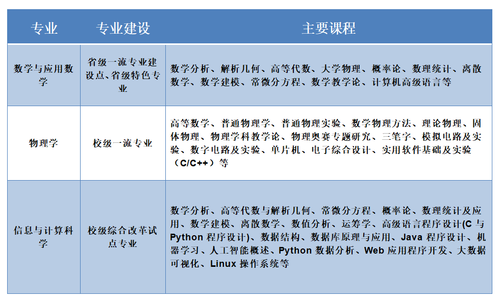 理学院现有数学与应用数学、物理学、信息与计算科学3个专业。学院“四二二”育人新模式和育人事迹及成效被新华社、新华网、央视新闻、中国教育报等主流媒体推介。
