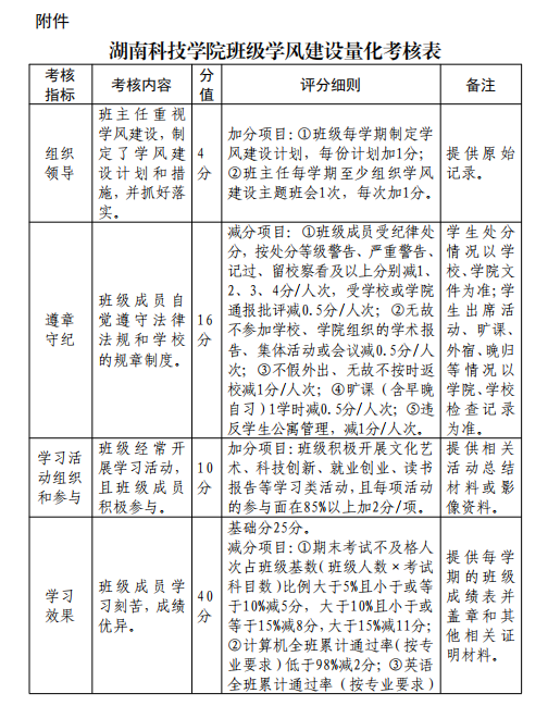 第三条班级的学风建设量化考核主要包括组织领导、遵章守纪、学习活动组织和参与、学习效果、学习竞赛获奖、教师评价等六个指标,考核指标体系的具体内容、标准见附件《开云(中国)Kaiyun·官方网站班级学风建设量化考核表》。
