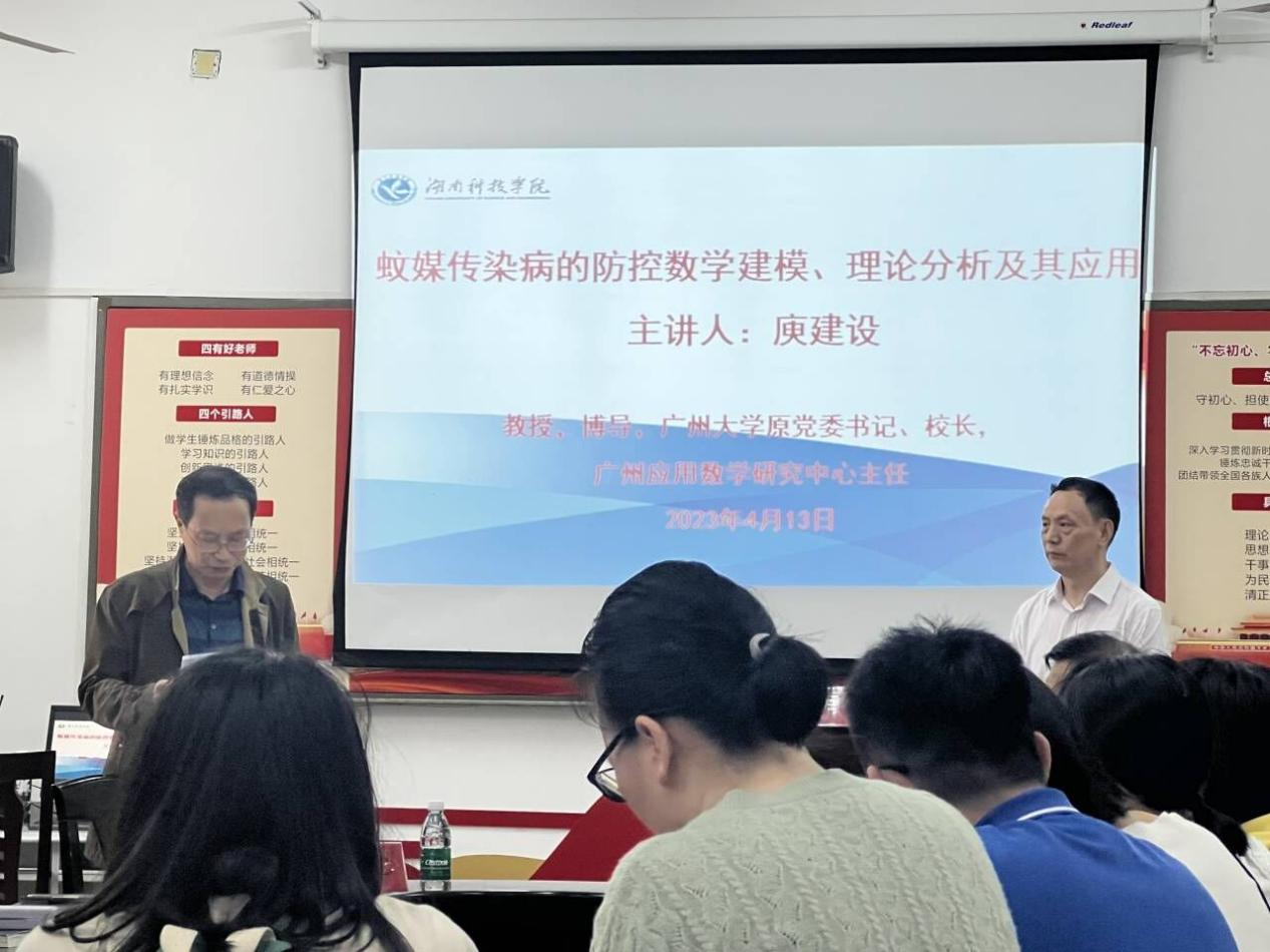 本网讯(通讯员:付诗越)为让我院学生充分了解数学建模理论,正确运用数学建模知识解决现实问题,,理学院于4月13日下午16:20,面向学院全体师生在明理楼308会议室,开展主题为“蚊媒传染病的防控数学建模、理论分析及其应用”讲座。由广州大学原党委书记、校长,广州应用数学研究中心主任、博士生导师庾建设教授主讲。