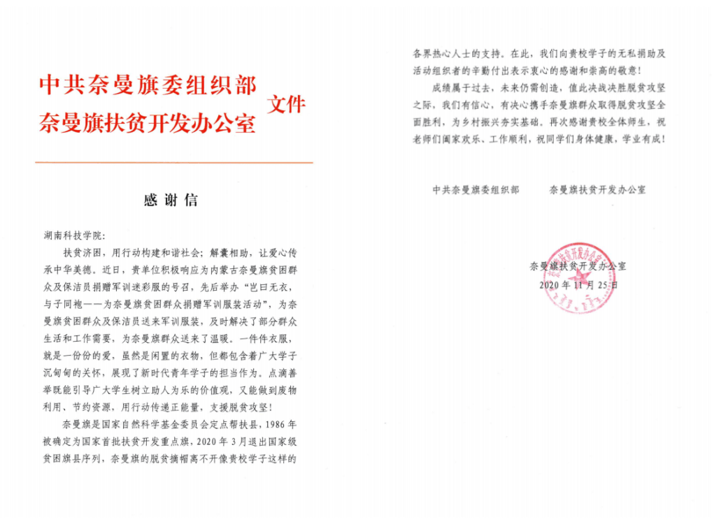 10月30日中午,校团委书记万李、理学院党总支书记刘华、理学院党总支副书记欧阳素勤参加军训服捐献仪式。永州市义工协会会长王宗清向共青团开云(中国)Kaiyun·官方网站委员会敬赠锦旗。从新生军训场上退下的迷彩服即将开启一段新的旅程,将“奉献、友爱、互助、进步”的志愿精神传承发扬。