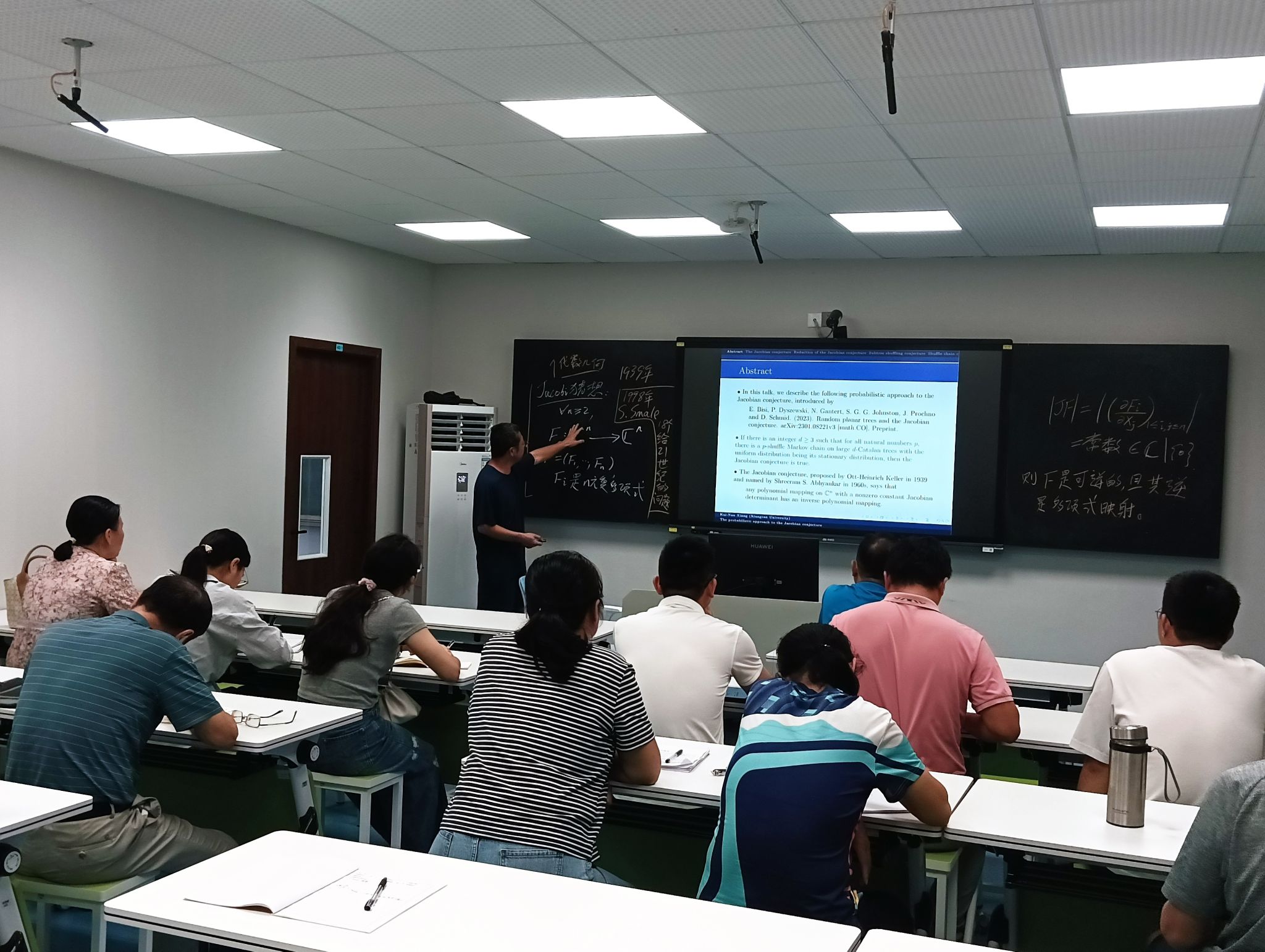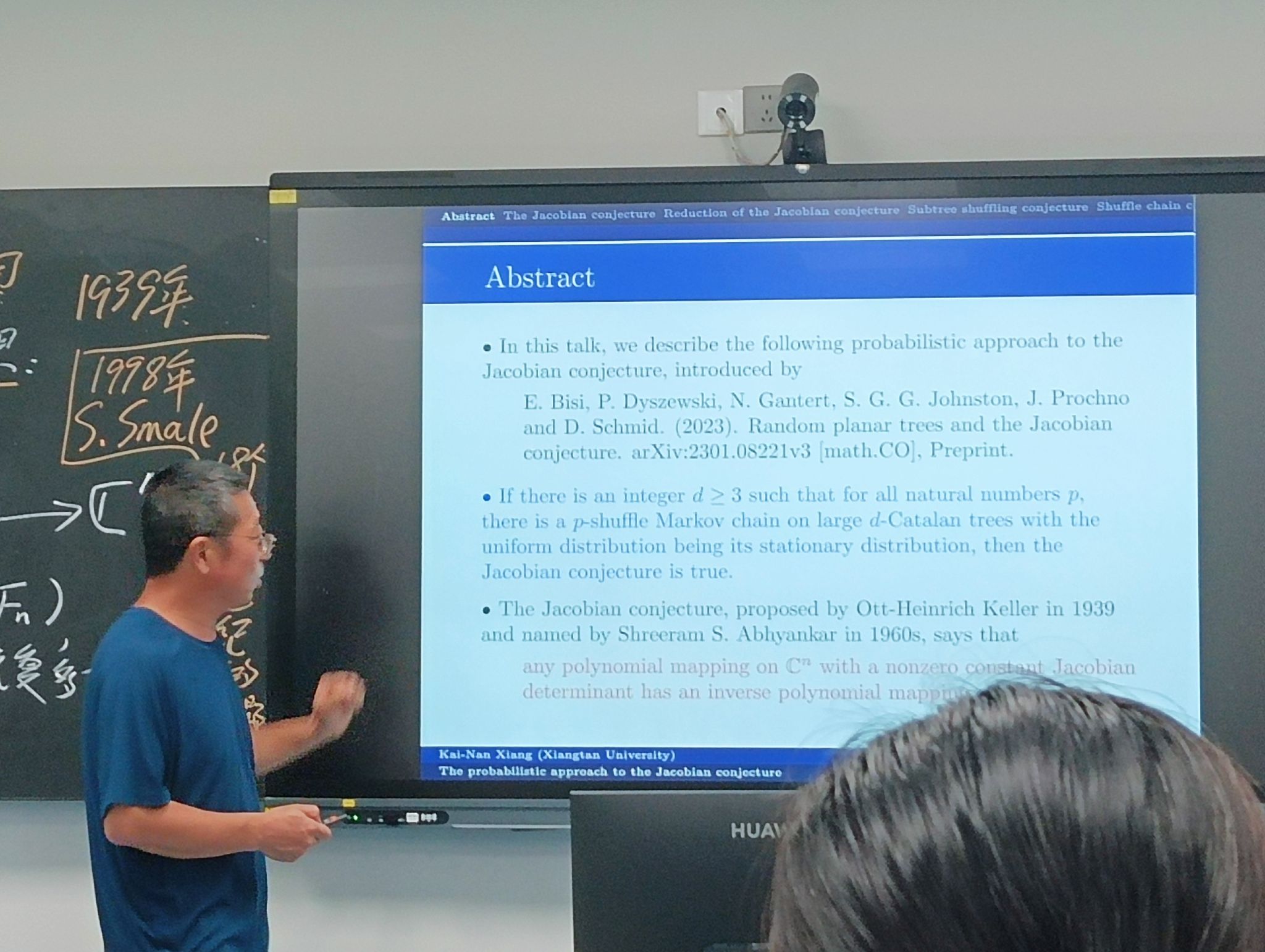 报告中,向开南教授围绕E. Bisi、P. Dyszewski等学者于2023年提出的雅可比猜想概率方法展开阐述。该方法通过随机平面树与雅可比猜想建立联系,提出若存在整数使得所有自然数,都存在以均匀分布为平稳分布的大卡特兰树洗牌马尔可夫链,则雅可比猜想成立。同时,向开南教授还分享了团队在相关概率问题上的研究思考。