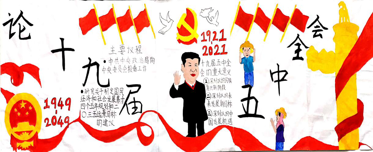 两幅“纯手工”绘制的海报用时两周完成,谈到为什么会有这样的创意和想法,同学们说:“想要通过“手绘”的形式,既能让更多同学亲身体验,参与其中;也能让十九届五中全会精神以喜闻乐见的形式,在同学们的心中落地生根。”