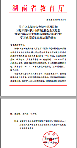 本网讯 近日,湖南省大学生学习贯彻习近平新时代中国特色社会主义思想暨第六届大学生思想政治理论课研究性学习成果展示竞赛落下帷幕,本次比赛共有来自全省104所高校的14620个学习小组参加复赛。通过书面复赛和现场决赛,分本科组和高职高专组,决出了特、一、二、三等奖和优秀组织奖。其中,我院郭开虎老师指导的学生荣获本次比赛三等奖。