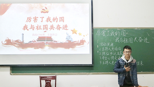 本网讯 (通讯员刘冰鑫 蔡晓倩)3月13日晚,党委书记陈弘作为马克思主义学院思政1701班班主任,在鹤鸣楼407教室参加该班新学期举行的“厉害了我的国,我与祖国共奋进”观影交流主题班会。