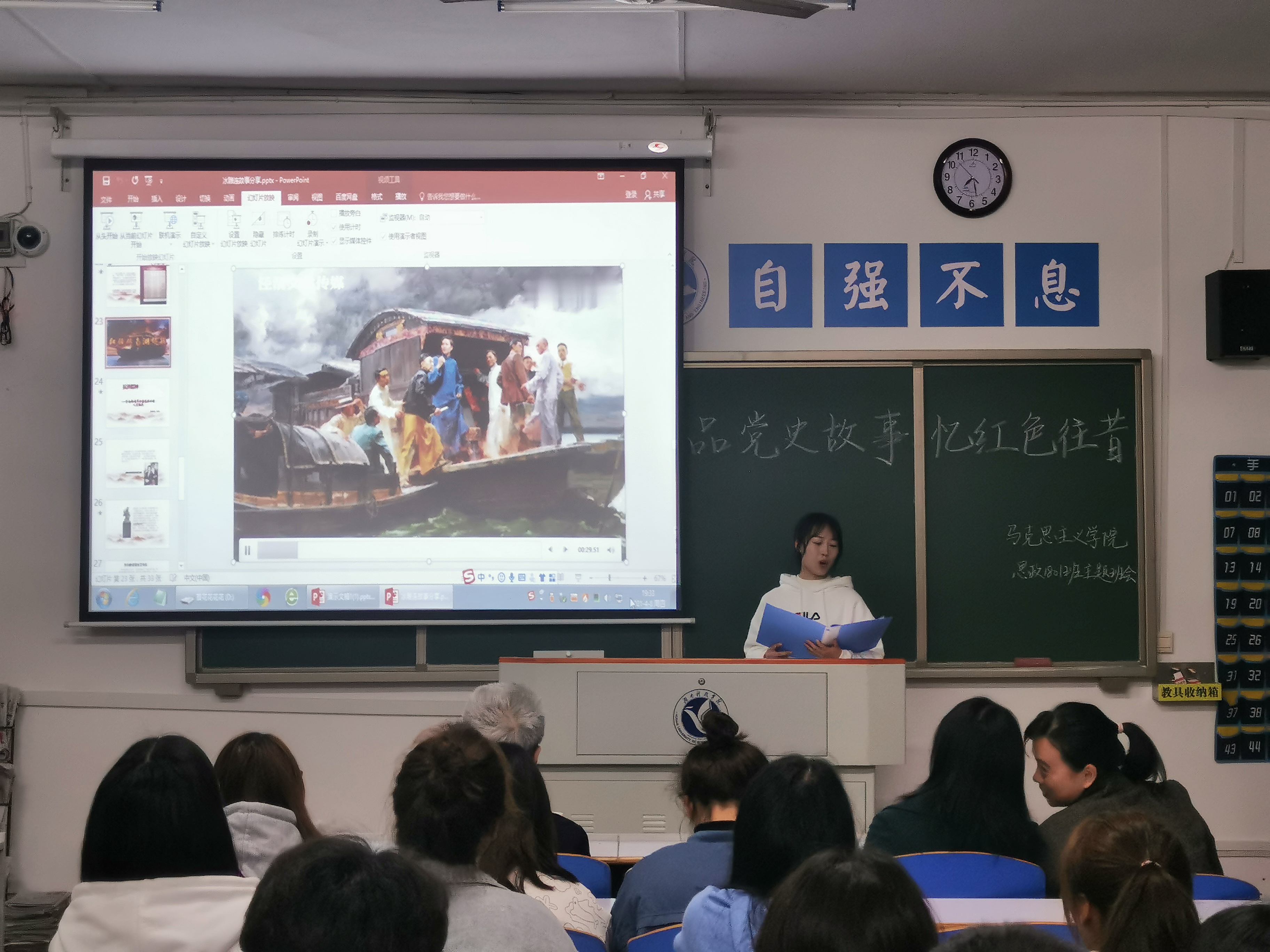在分享过程中,5位同学将红色故事娓娓道来,夏青叶同学讲述了永州英魂陈树湘的故事;苏田心同学讲述了抗美援朝时期冰雕连的故事;刘慧同学朗诵了《红船从南湖启航》,缅怀过往、期许未来,将班会气氛推向高潮。