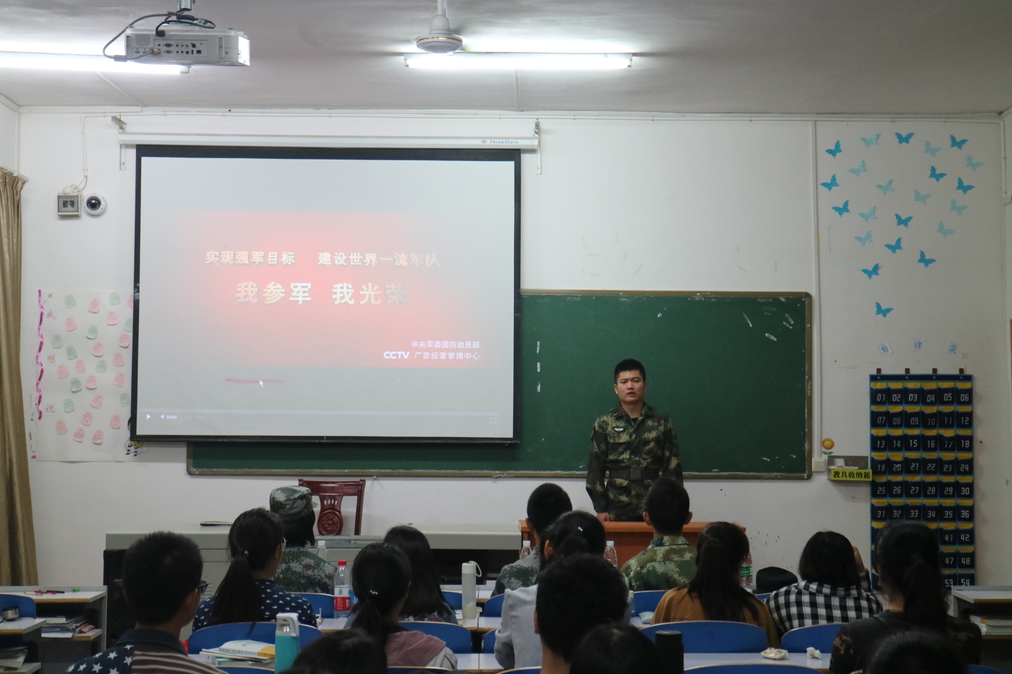 本网讯(通讯员 张亚娟)为响应国家征兵号召,增强大学生的国家意识和历史责任感,思政1701班于4月12日晚在407教室开展“我参军,我光荣”的主题班会。