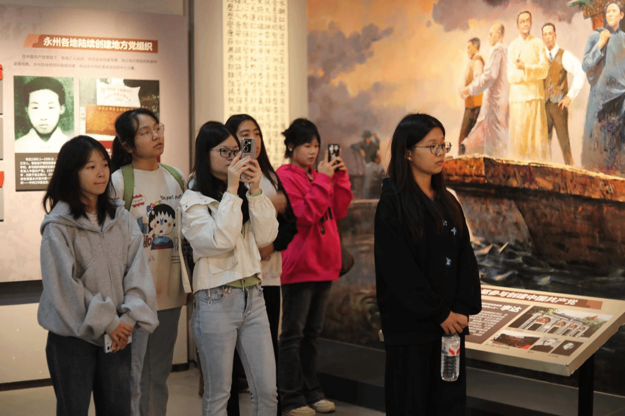 陈列馆里,1000多张照片、50多件革命文物、4万多字……同学们在“开天辟地”“改天换地”“翻天覆地”“惊天动地”主展厅感悟永州这片红色热土上的峥嵘岁月与红色底蕴。当来到红三十四师师长陈树湘展区,展柜中泛黄的战斗遗物、墙上定格的历史照片,搭配讲解员生动的讲述,将1934年红军血战湘江时,陈树湘“断肠明志、绝不投降”的壮烈场景拉到眼前。“以前在课本里学过这个故事,今天看到实物,才真正懂了什么是‘绝对忠诚’。”会员张娜一边记录,一边感慨。从李达、李启汉等永州早期共产党人播撒革命火种,到红军长征过境永州的足迹,一件件实物、一段段故事,让“红色历史”变得可触可感,也让大家对湖湘红色文化有了更深的认同。