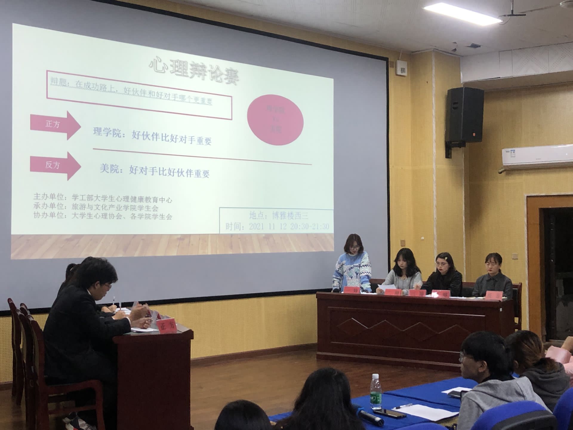 本网讯(通讯员周怡君)2021年11月12日晚,开云(中国)Kaiyun·官方网站于博雅楼开展了八强进四强的辩论赛。本次辩论赛,主办单位为学工部大学生心理健康教育中心,承办单位为旅游与文化产业学院学生会,协办单位为大学生心理协会及各学院学生会。本次辩论赛的辩题为“在成功路上,好伙伴和好对手哪个更重要”,正方为持“好伙伴比好对手重要”观点的理学院与持“好对手比好伙伴重要”观点的美院。