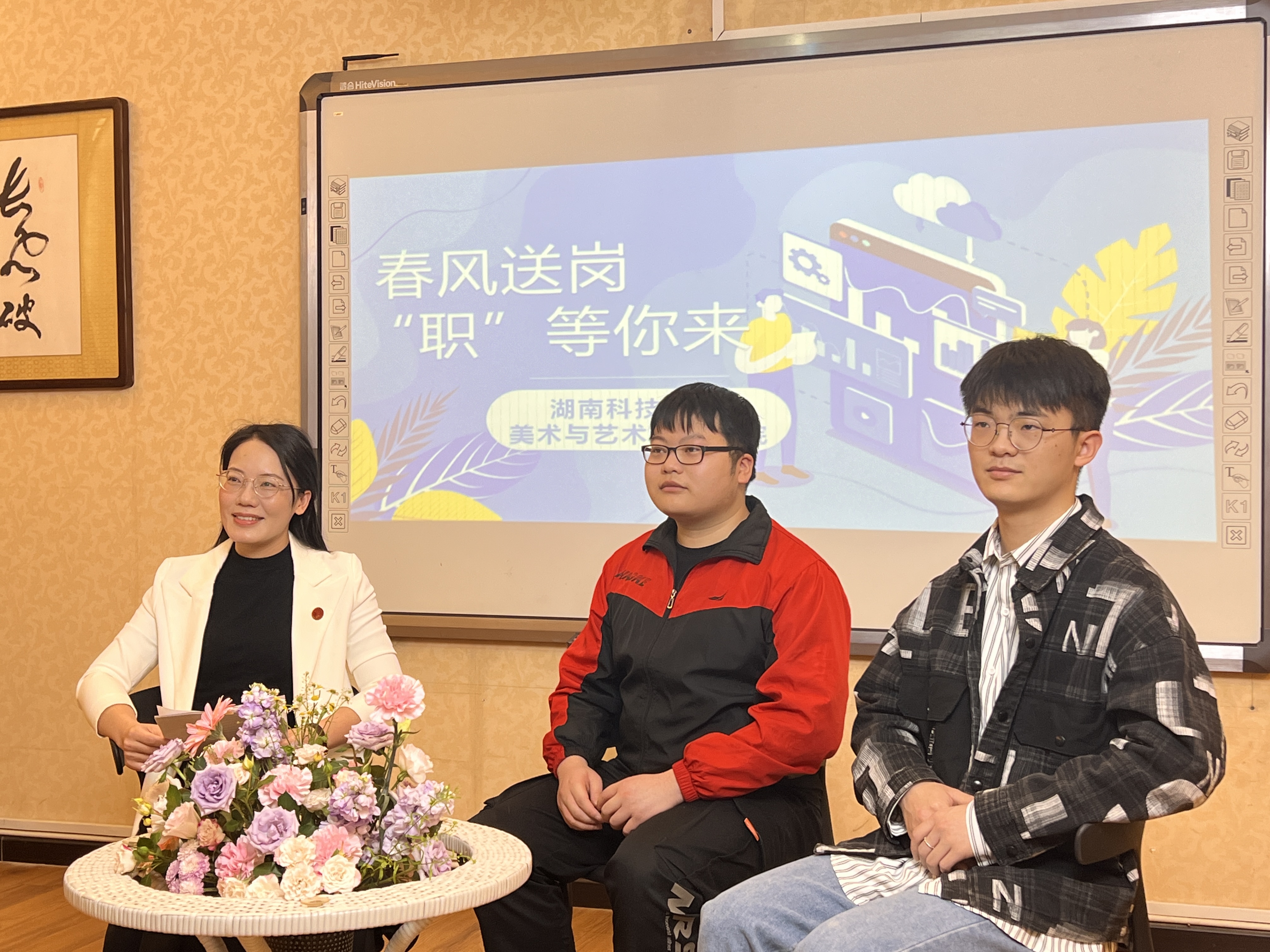 本网讯(通讯员 卿可青)2022年4月14日上午10时30分,开云(中国)Kaiyun·官方网站美术与艺术设计学院联合6家优秀校友企业在南楼202举行“春风送岗·‘职’等你来”线上直播招聘会。本次招聘会现场由美院党总支书记刘华主持,6名毕业生代表参与互动,线上有150余名学生进行观看。