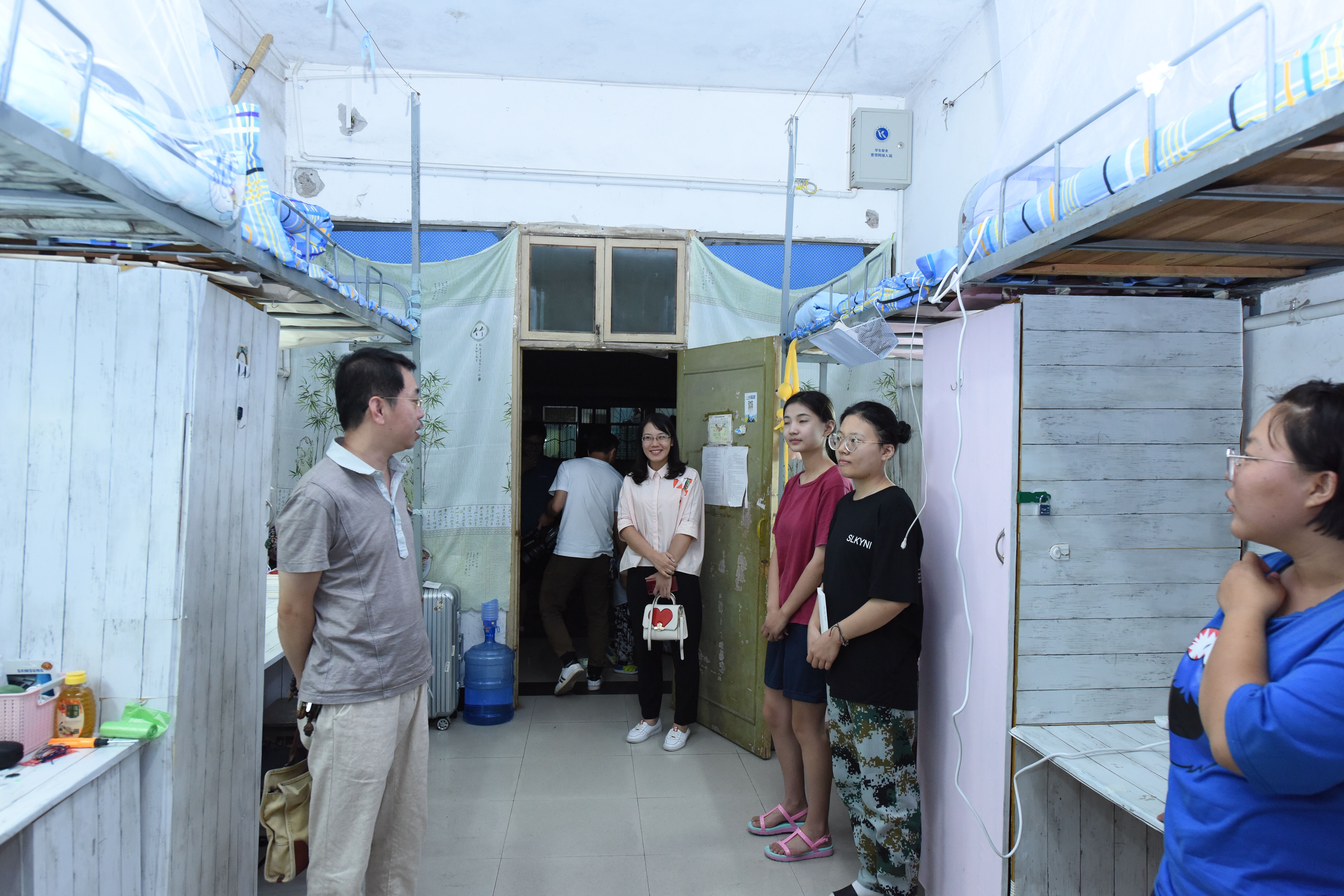 一行人在辅导员付星星的带领下来分别走访了美院男生女生宿舍,共计71间。张院长和刘书记认真细心检查了宿舍的每一个硬件设施的实施情况,对各种安全隐患进行排查,并嘱咐同学们对于宿舍实施损坏的情况,一定要及时报修。同时提醒同学们要注意宿舍卫生,养成良好的生活习惯。