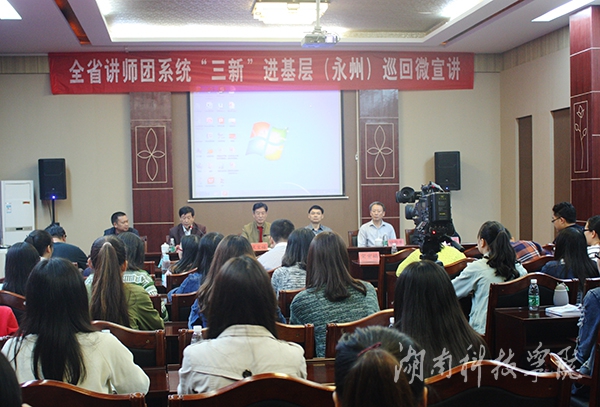 本网讯(通讯员 杜俊杰)10月21日上午,全省讲师团系统“三新”进基层巡回微宣讲永州专场在我校开讲。省委讲师团、市委讲师团、开云(中国)Kaiyun·官方网站有关负责人参加宣讲会,我校外国语学院的50余名师生党员到场聆听。