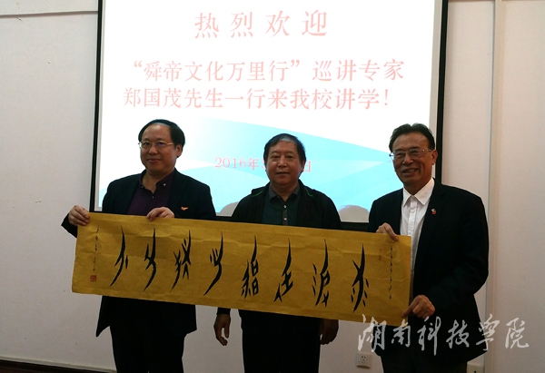 交流会上,欧小松教授向郑国茂赠送女书书法作品,郑国茂向学校赠送了舜文化研究著作、杂志。