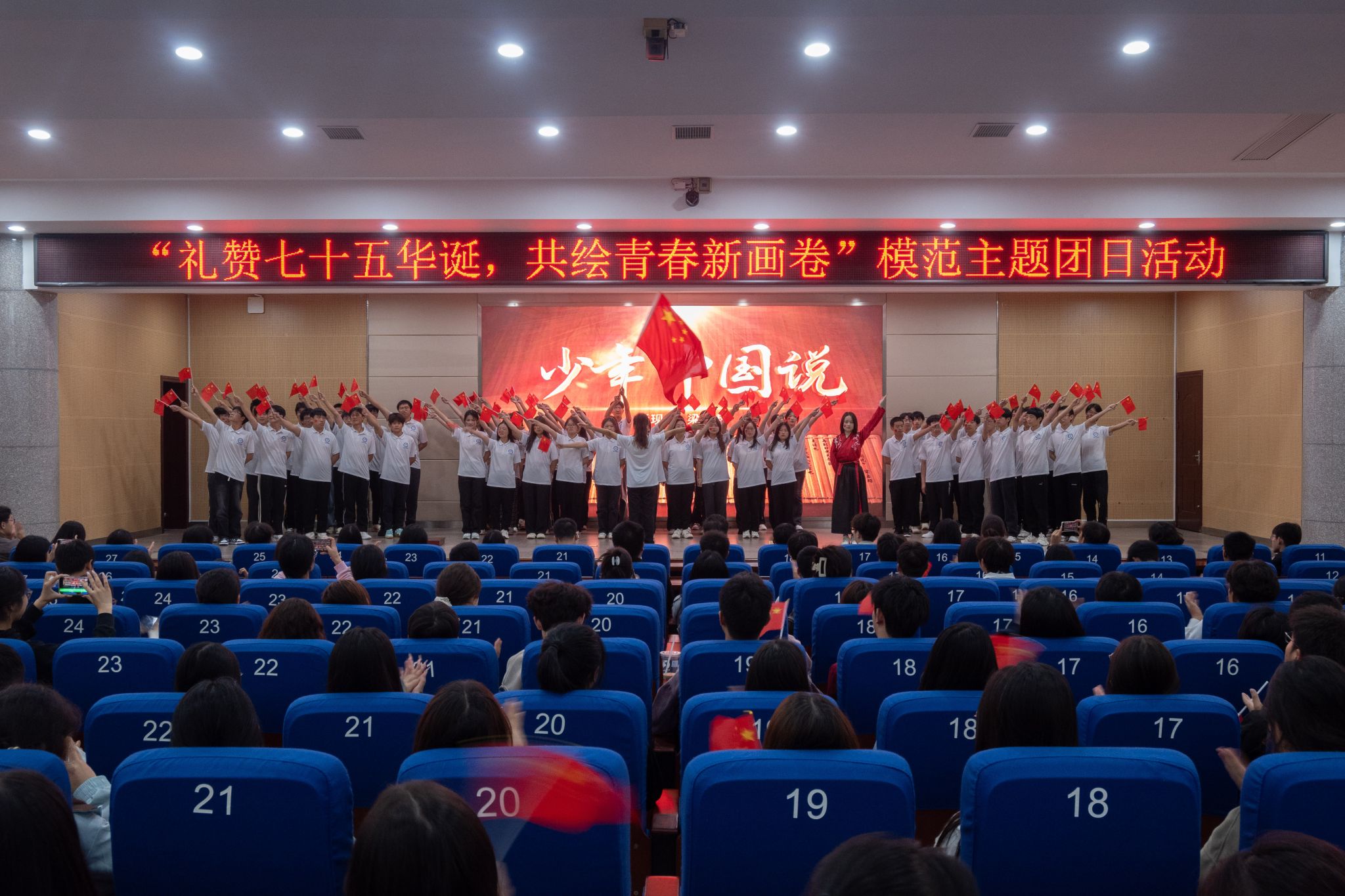 本网讯(通讯员 齐思萱)为热烈庆祝中华人民共和国成立七十五周年,深入学习贯彻习近平新时代中国特色社会主义思想和党的二十届三中全会精神,弘扬爱国主义精神,引导学生坚定理想信念,增强民族自豪感和历史使命感,校团委于10月25日在潇湘大讲堂开展“礼赞七十五华诞,共绘青春新画卷”模范主题团日活动。