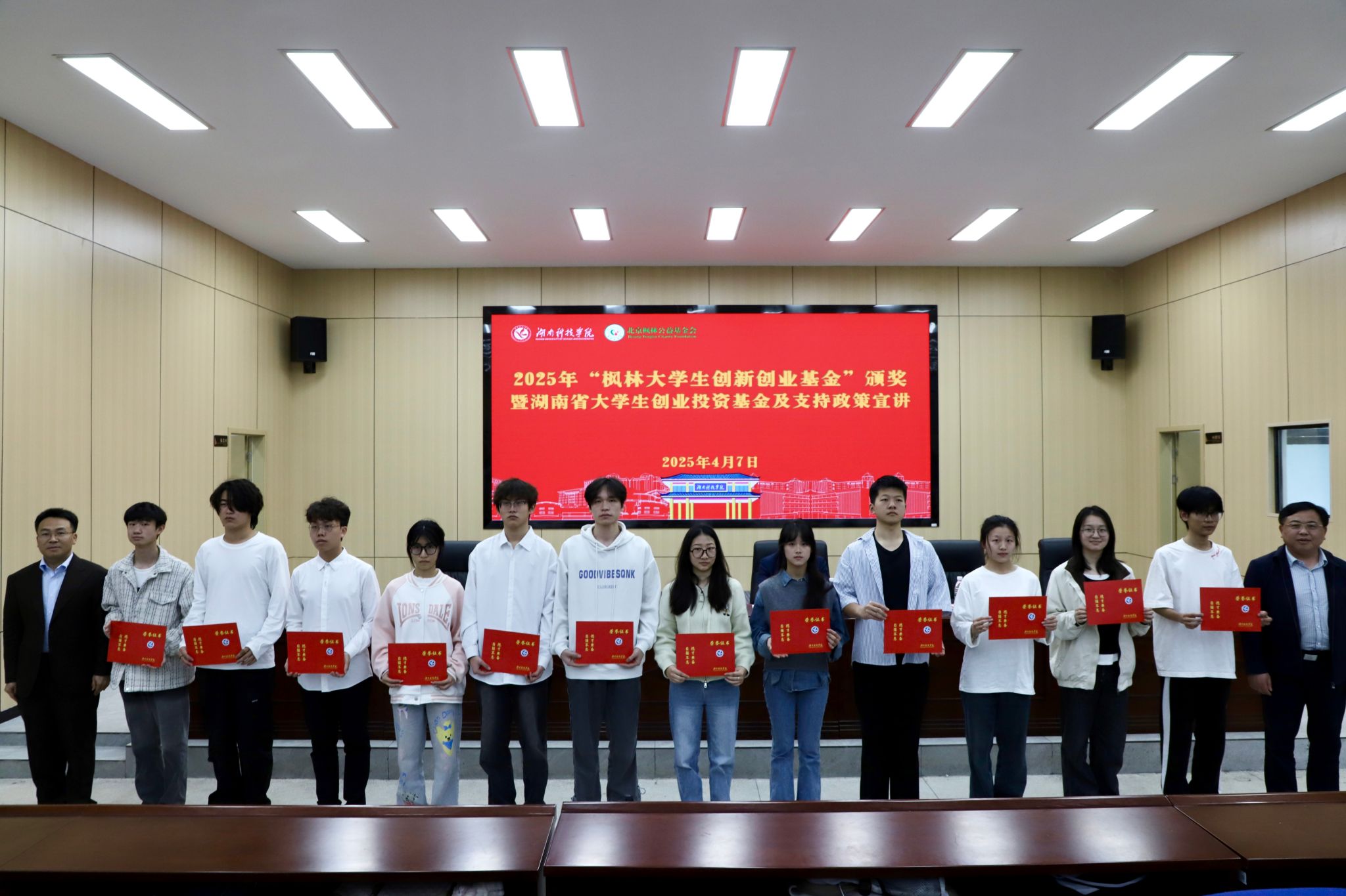 本网讯(记者 刘斌 唐晶 摄影 潘加)4月7日,2025年“枫林大学生创新创业基金”颁奖仪式暨湖南省大学生创业投资基金及支持政策宣讲活动在我校举行。我校77级校友、北京枫林公益基金会会长张亚红,副校长郑银芳出席活动,34个获基金资助的学生创业项目负责人、指导老师代表以及相关工作人员参加。