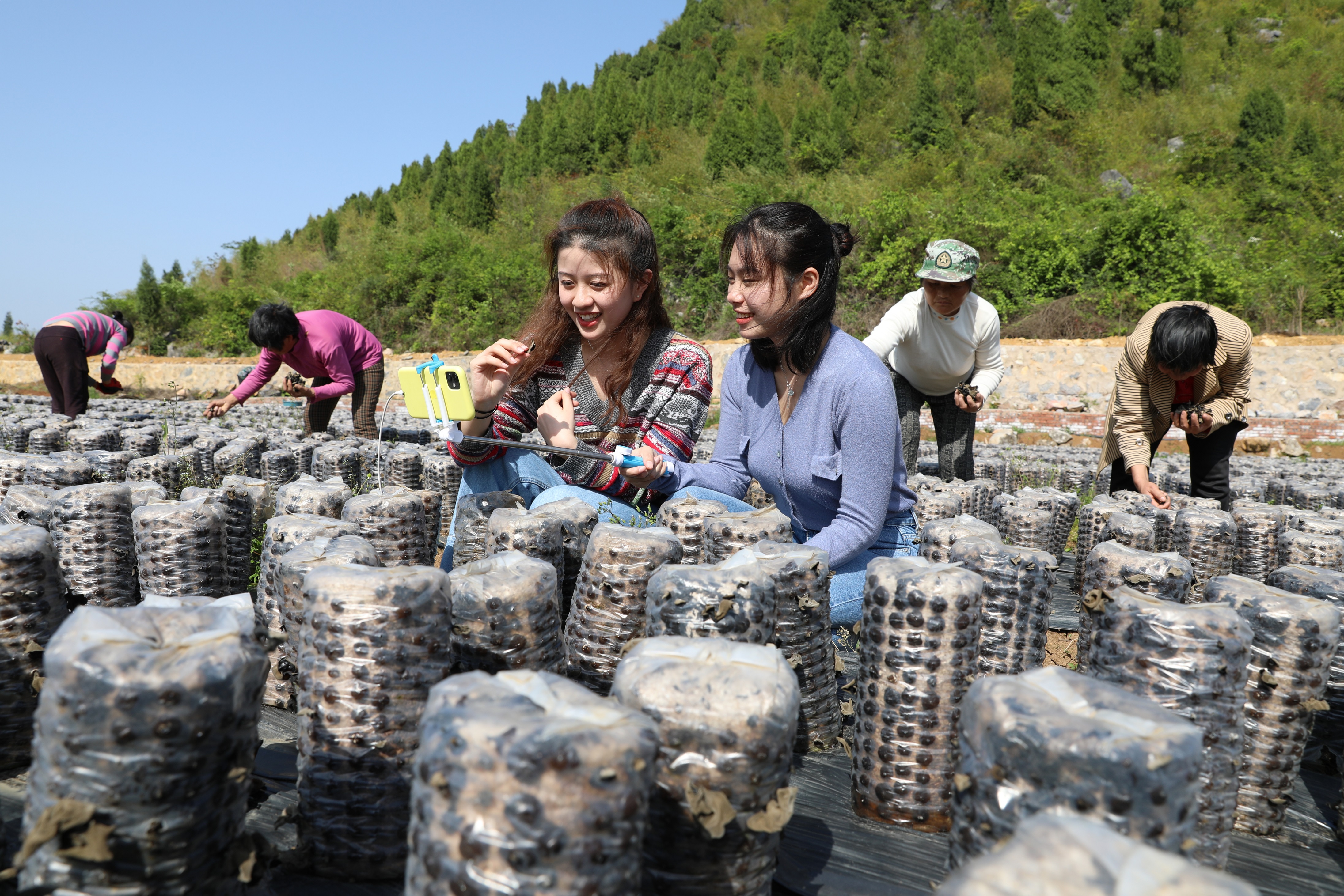 本网讯 4月15日,大学生在田间直播试吃凉拌木耳。当天,经济与管理学院营销专业的学生来到新田县枧头镇马场岭村木耳种植基地,网络直播当地黑木耳产品,并现场试吃,吸引粉丝下单。连日来,我校学生利用专业优势直播“带货”,助力当地黑木耳销售。