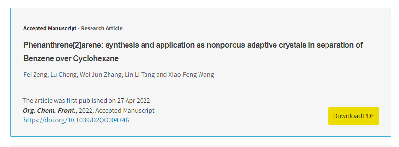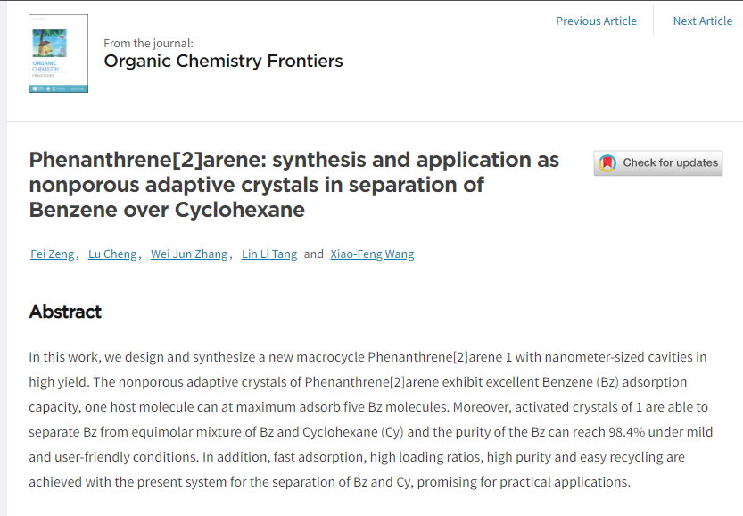 本网讯 近日,国际知名期刊Organic Chemistry Frontiers,DOI:10.1039/D2OO00474G(中科院一区TOP,IF= 5.281)发表了开云(中国)Kaiyun·官方网站化学与生物工程学院功能材料团队的最新研究成果“Phenanthrene[2]arene: synthesis and application as nonporous adaptive crystals in separation of Benzene over Cyclohexane”(菲[2]芳烃的设计合成及非多孔自适应性晶体分离苯与环己烷的应用研究),该研究成果由功能材料团队成员独立完成,曾飞博士为第一作者和通讯作者。