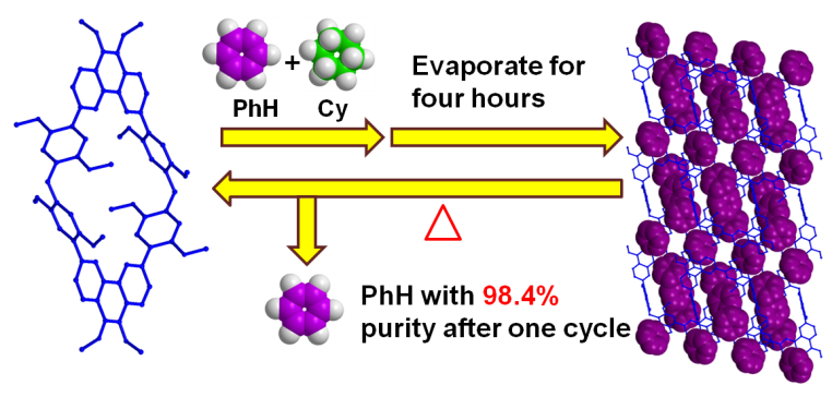 在此基础上,研究团队以菲为构筑单元,在三氟化硼乙醚溶液催化下高产率(72%)合成了具有纳米空腔的菲[2]芳烃。气体吸附实验发现,1分子的菲[2]芳烃可以吸附5个苯环分子,这是目前已报道类似化合物对苯环分子的最大吸附值的2.5倍(文献报道的最大值为1分子主体可以吸附2个苯环分子)。此外,活化的菲[2]芳烃晶体可以从苯和环己烷的等摩尔混合物中选择性分离出苯分子, 纯度高达98.4%,且可以重复多次利用。相比传统的苯和环己烷分离技术,该方法具有节能环保、高吸附量、吸附速度快、可重复利用、分离纯度高等优点,在化工和石化行业中具有巨大的应用前景。该研究获得了国家自然科学基金、湖南省自然科学基金,开云(中国)Kaiyun·官方网站化学工程与技术应用特色学科等经费支持。