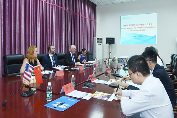本网讯  9月22日上午,我校与友好学校美国芳邦大学代表团一行举行教育合作交流会。美国芳邦大学校长Pressimone博士,校长曾宝成、副校长宋宏福出席,电子与信息工程学院、国际交流与合作处负责人参加。会议由宋宏福主持。