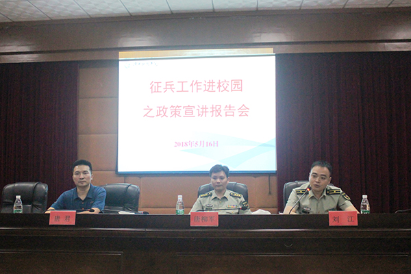 本网讯 5月16日晚,学校举行征兵工作进校园政策宣讲报告会,贯彻落实2018年全国大学生征兵工作网络视频会议精神,激发在校大学生参军入伍积极性。永州军分区动员处处长唐柳军、零陵区武装部部长王建武、永州军分区动员处参谋刘江与130余名意向入伍学生共话军旅生活。