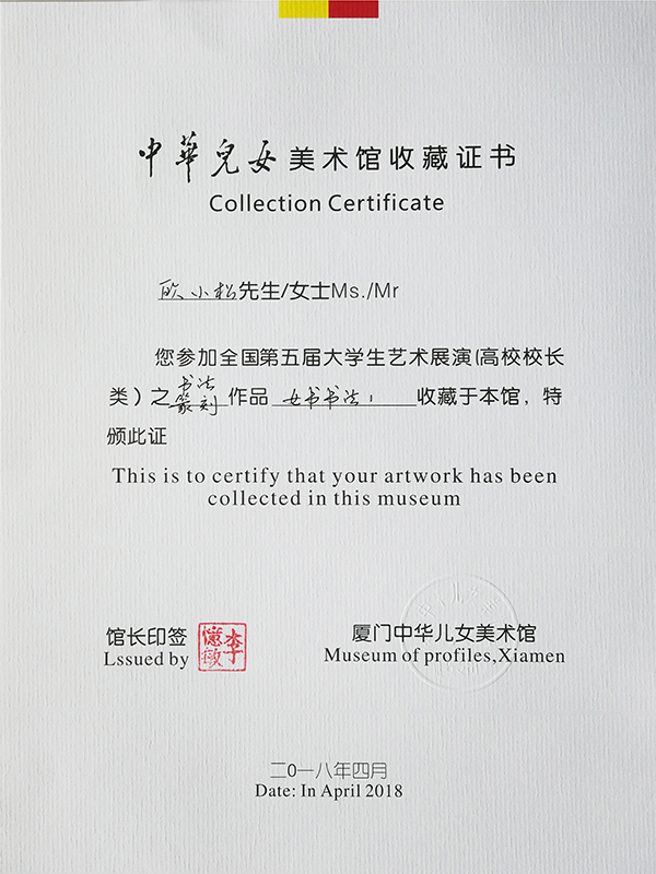 本网讯 日前,由教育部主办的全国第五届大学生艺术展演活动闭幕。欧小松教授的书法篆刻作品《女书书法》荣获全国高校校长书画摄影作品“校长风采奖”,并被《中华儿女美术馆》收藏。