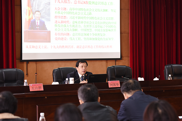 刘国华以“以十九大精神武装头脑 打好高校意识形态领域阵地战”为主题作习近平新时代中国特色社会主义思想和党的十九大精神专题辅导报告,全面分析了意识形态的作用与当前的斗争态势,深度评析了需要高度警惕的几种错误思潮,并从“坚持马克思主义指导地位 掌握领导权、弘扬社会主义核心价值观 唱响主旋律、传承中华优秀传统文化 树立自信心、强化抵制错误思潮的责任感 增强敏锐性、强化网络建设和监管工作 掌控话语权”等五方面对如何在意识形态领域打好阵地战进行了深刻解读。
