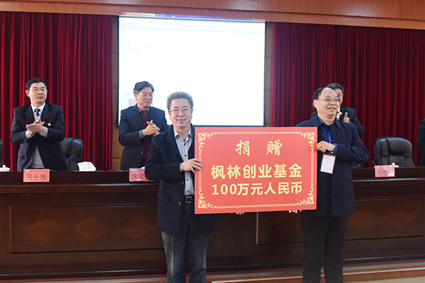 北京枫林公益基金会会长、学校北京校友会会长、77级化学专业校友张亚红向学校捐赠100万元创业基金。他说,每次回到母校都能感受到学校的发展,此次捐赠主要用于鼓励和支持在校学生创新创业,发挥科技创新在人才培养中的重要作用,鼓励更多的同学和校友贡献和回馈社会。