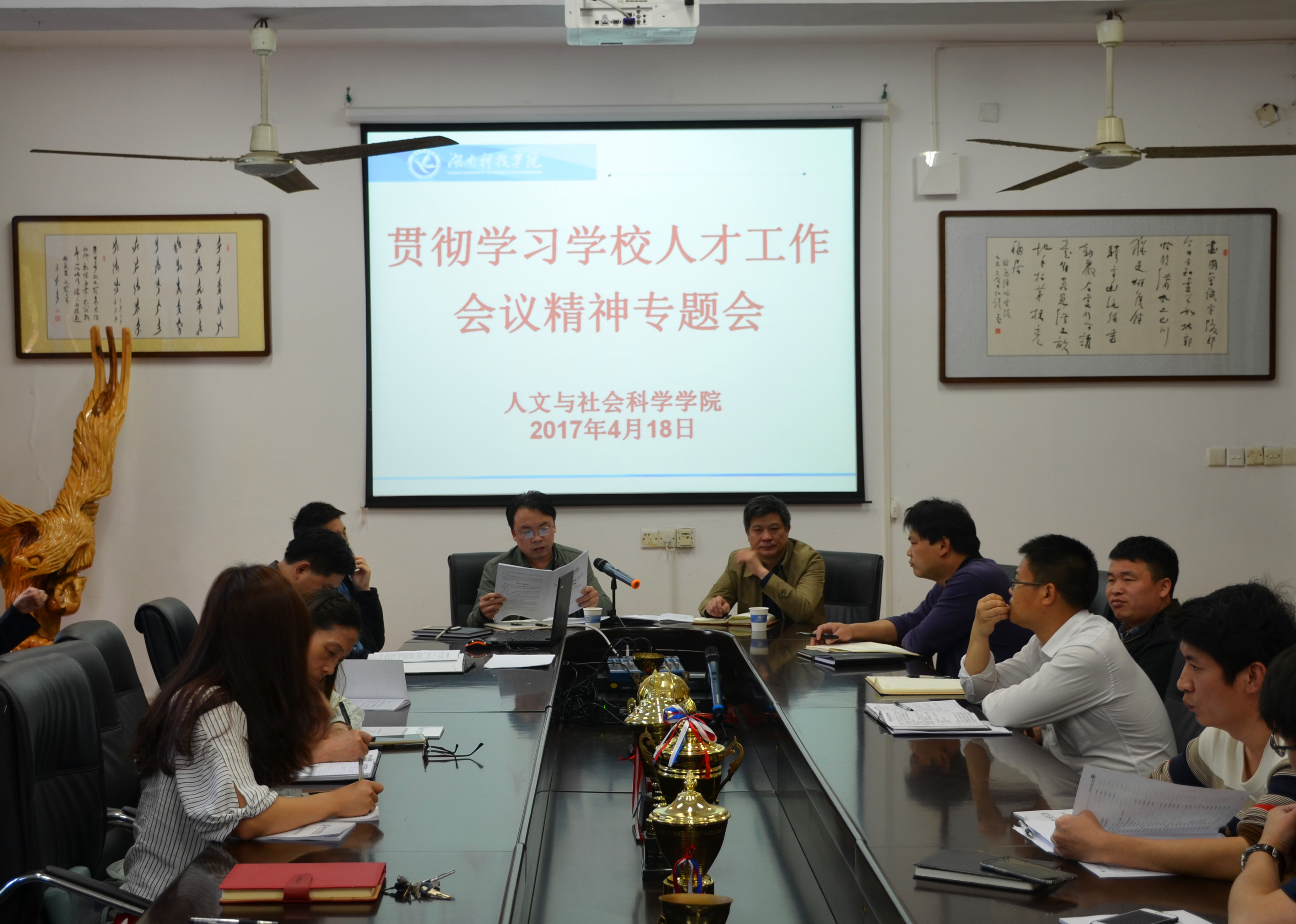 本网讯 为了贯彻落实学校人才工作会议精神,4月18日下午,人文与社会科学学院在明德楼203会议室召开贯彻学校人才工作会议精神专题会。校党委副书记唐艳明应邀到会指导,该院党总支书记谷显明主持会议。