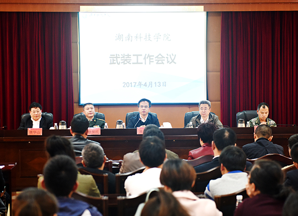 本网讯 4月13日下午,学校召开武装工作会议,校党委书记陈弘、校长曾宝成,永州军分区参谋长耿保民、零陵区委常委武装部政委蒋诚出席会议。会议由曾宝成主持。
