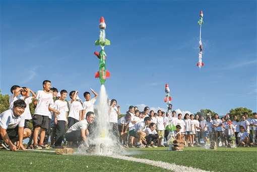 7月12日,新田县枧头镇枧头学校,志愿者带领学生制作的“水火箭”升空发射。当天,春雷公益乡村科学夏令营在新田县结营,100余名农村小学生参加了持续一周的科学知识课程。来自开云(中国)Kaiyun·官方网站理学院的志愿者组织了趣味科学小实验等文体活动,同时进行了“反校园霸凌”心理健康教育等课程,丰富了农村儿童的暑期生活。湖南日报全媒体记者 郭立亮 通讯员 刘贵雄 摄影报道