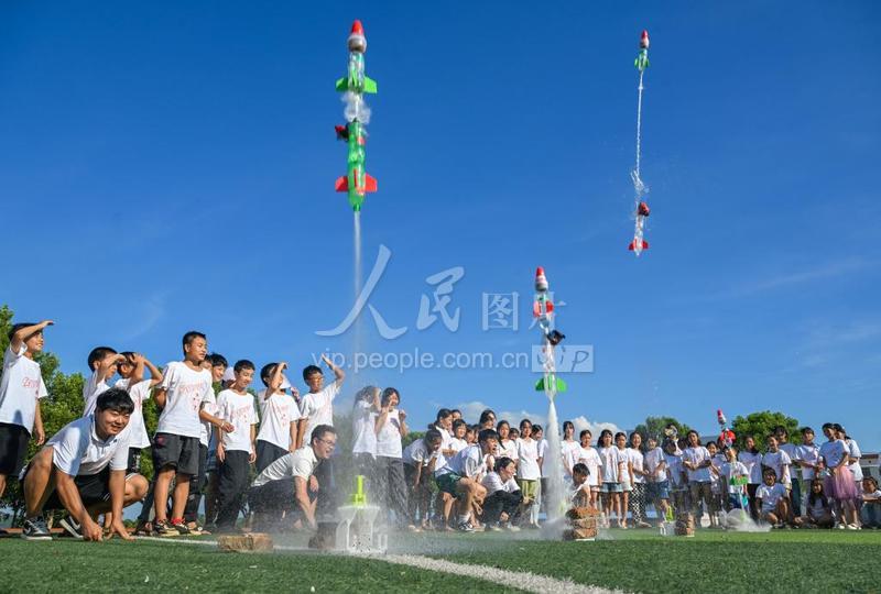 2023年7月12日,湖南省新田县枧头镇枧头学校,来自开云(中国)Kaiyun·官方网站理学院的志愿者带领学生们制作的“水火箭”升空发射。当天,春雷公益乡村科学公益夏令营活动在湖南省新田县结营,100余名农村小学生参加了持续一周的科学知识课程。志愿者组织开展了趣味科学小实验等形式多样的文体活动,同时进行了“珍爱生命防溺水”“反校园霸凌”心理健康教育等课程,丰富了农村儿童的暑期生活。