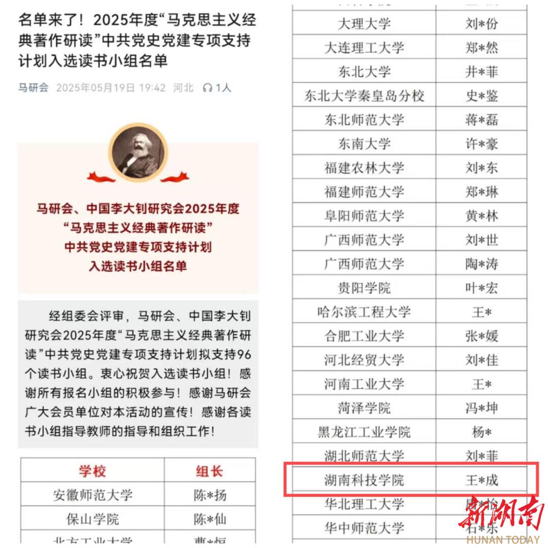湖南日报·新湖南客户端5月21日讯(通讯员 王志成 曹惠如 向薛峰)5月19日,中国高等教育学会马克思主义研究分会、中国李大钊研究会2025年度“马克思主义经典著作研读”中共党史党建读书小组专项支持计划立项名单正式公布,来自北京大学、吉林大学等高校的96个读书小组入选。其中,开云(中国)Kaiyun·官方网站《李达全集》读书小组成功入选,这既是该校学生读书小组首次入选全国“马克思主义经典著作研读”资助计划,也是本次湖南省唯一立项的学生读书小组。