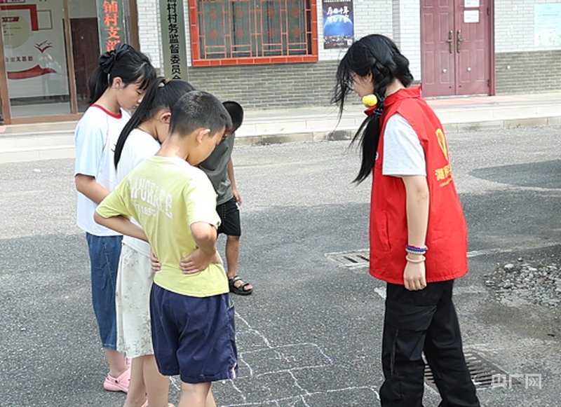 大学生志愿者指导孩子们跳格子(央广网发 张潇悦 摄)