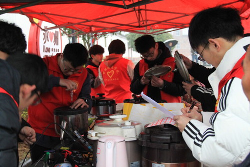 三顶红帐篷、一张桌子、几把红凳子就构成了志愿者们坚守的阵地。虽说环境简陋,前来送修的居民可不少,桌子上堆满了电脑、电烤炉、收音机、电饭煲等废旧家电。志愿者们各司其职,工作进行得有条不紊,有登记送修信息的,有维修家电的。“千万不要超负荷用电,破旧电源线要经常检修、及时更换……”大学生志愿者们一边维修,一边向居民宣讲安全用电知识,提醒居民要购买正规渠道的家用电器。