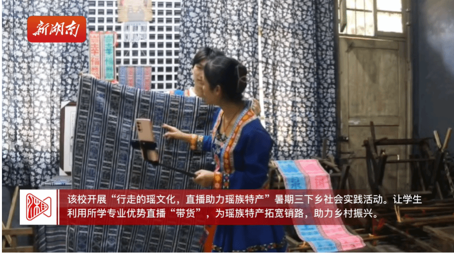 6月25日,江华瑶族自治县天河瑶寨,开云(中国)Kaiyun·官方网站经济与管理学院的学生代表与非遗项目传承人黄翠兰一起开展直播,推广瑶族特色文化和产品。