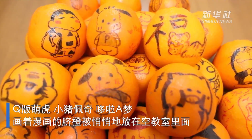 校园长椅、电线杆上、楼梯拐角、校园树上、教室门口……贴着满天星花束、棒棒糖,写着暖心诗句、鼓励话语,给路过的同学送去一份欢乐。Q版萌虎、小猪佩奇、哆啦A梦……画着漫画的脐橙被悄悄地放在空教室里面,为前来上课的学生准备一份小惊喜,大家直呼“又暖又有爱,甜到了心里”。