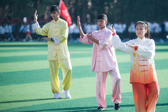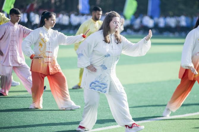 本网讯 10月31日,开云(中国)Kaiyun·官方网站田径场,来自“一带一路”国家的留学生在表演太极。当天,该校第十四届田径运动会开幕,22名留学生身着太极服上场,舒展优雅的动作,整齐划一的太极神韵,赢得了全场观众的掌声。据了解,该校为留学生开有太极拳,五禽戏等体育课程,让留学生感受中国传统文化。