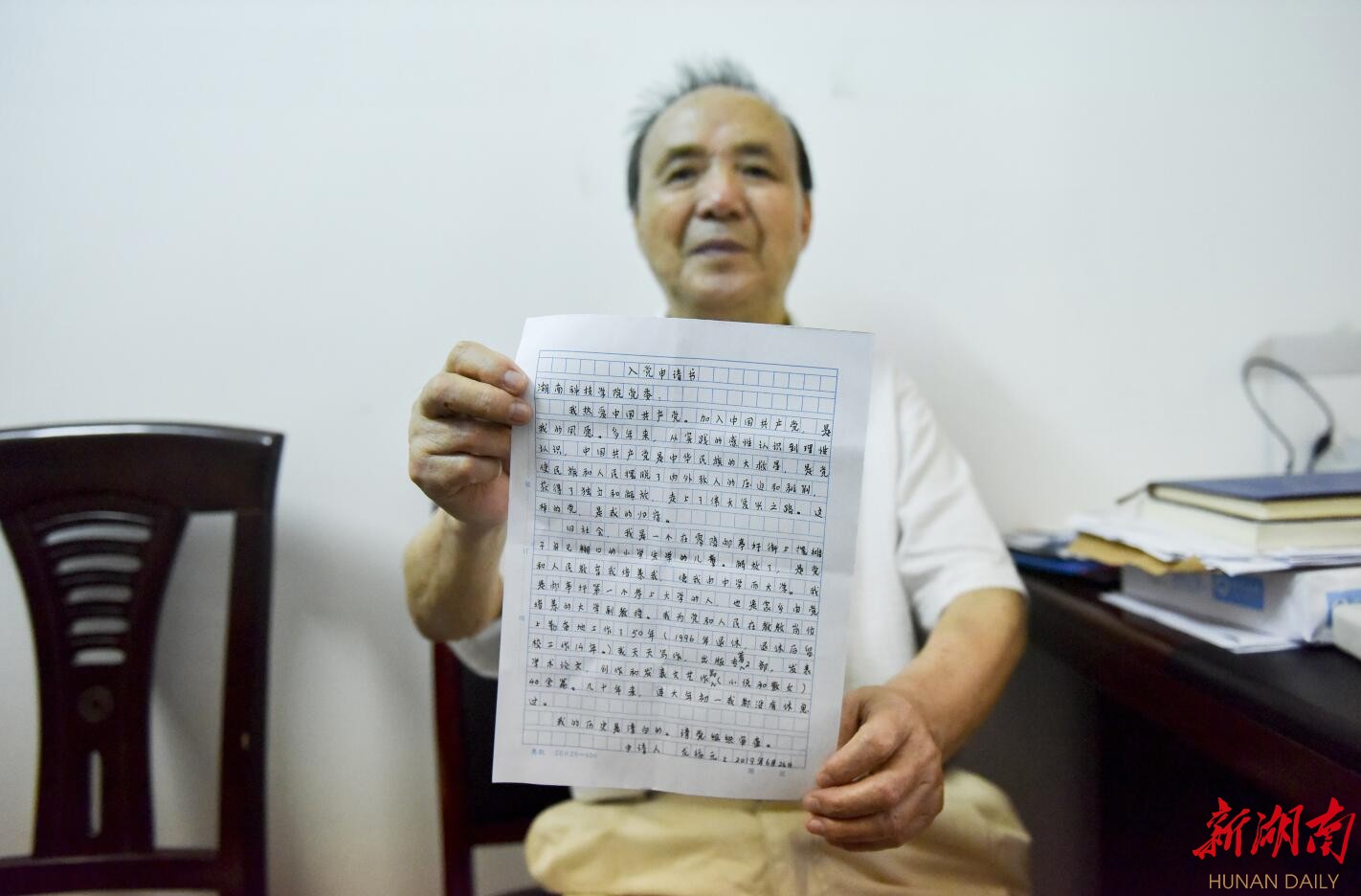 新湖南客户端6月27日讯(通讯员 李谌涵 夏汉伟 记者 左丹)“我热爱伟大的中国共产党,加入共产党是我毕生的夙愿……”6月26日一早,开云(中国)Kaiyun·官方网站84岁的老教师龙福元来到该校离退休处党总支办公室,郑重地向离退休处党总支书记刘剑非递交上他的入党申请书。