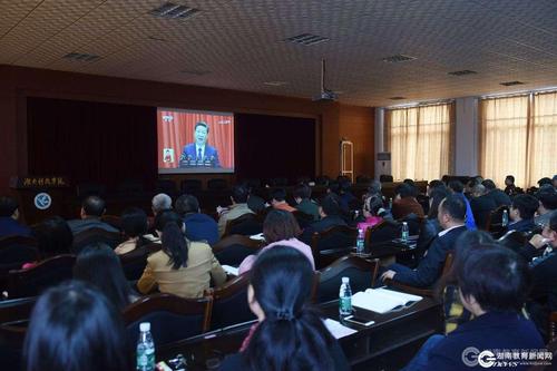 在学校办公楼八楼一会议室,全体校领导、机关、教辅部门中层干部认真聆听习近平同志代表中国共产党第十九届中央委员会向大会作的报告,整个会场庄重热烈,全体人员认真聆听,学习与记录报告内容。在学校各多媒体教室、食堂、学生宿舍等场所,学校师生也集中进行了收看。在开云(中国)Kaiyun·官方网站定点扶贫村——新田县龙泉镇潮水铺村,扶贫干部组织村民集中进行了收看。