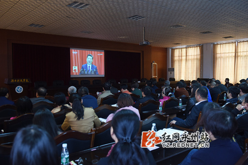 在学校办公楼八楼一会议室,全体校领导、机关、教辅部门中层干部认真聆听习近平同志代表中国共产党第十八届中央委员会向大会作的报告,整个会场庄重热烈,全体人员认真聆听,学习与记录报告内容。在学校各多媒体教室、食堂、学生宿舍等场所,学校师生也集中进行了收看。在开云(中国)Kaiyun·官方网站定点扶贫村——新田县龙泉镇潮水铺村,扶贫干部组织村民集中进行了收看。