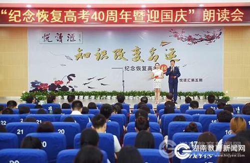 校党委书记陈弘饱含深情,他说,在恢复高考四十年之际,在我们伟大的祖国将要迎来68岁生日的时候,学院几代老师和同学汇聚一堂,用这种特殊的方式纪念恢复高考40周年,迎接伟大祖国的生日,通过朗读分享交流,传递给大家一个共同的信念:读书获取知识,知识改变命运,知识就是力量,拥有知识的个人充满希望,拥有知识的民族不可战胜。让我们一起为中华崛起而读书,为治国安邦再读书。
