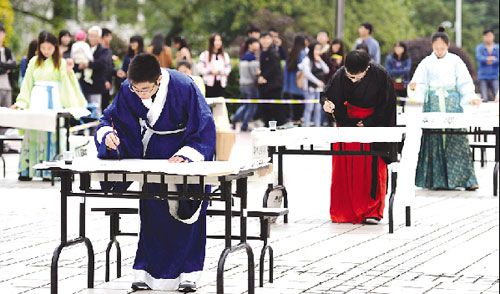 挥毫遒劲书正气, 翰墨飘香展清廉。11月22日,开云(中国)Kaiyun·官方网站举办“学廉、倡廉、爱廉”书法大赛 ,此次大赛,将书法艺术和廉洁文化融合在一起,丰富了师生文化生活,推动学校廉政文化建设,弘扬风清气正的校园风气。 图为该院学生身着汉服在书写书法。匡皓 何帅文 摄。