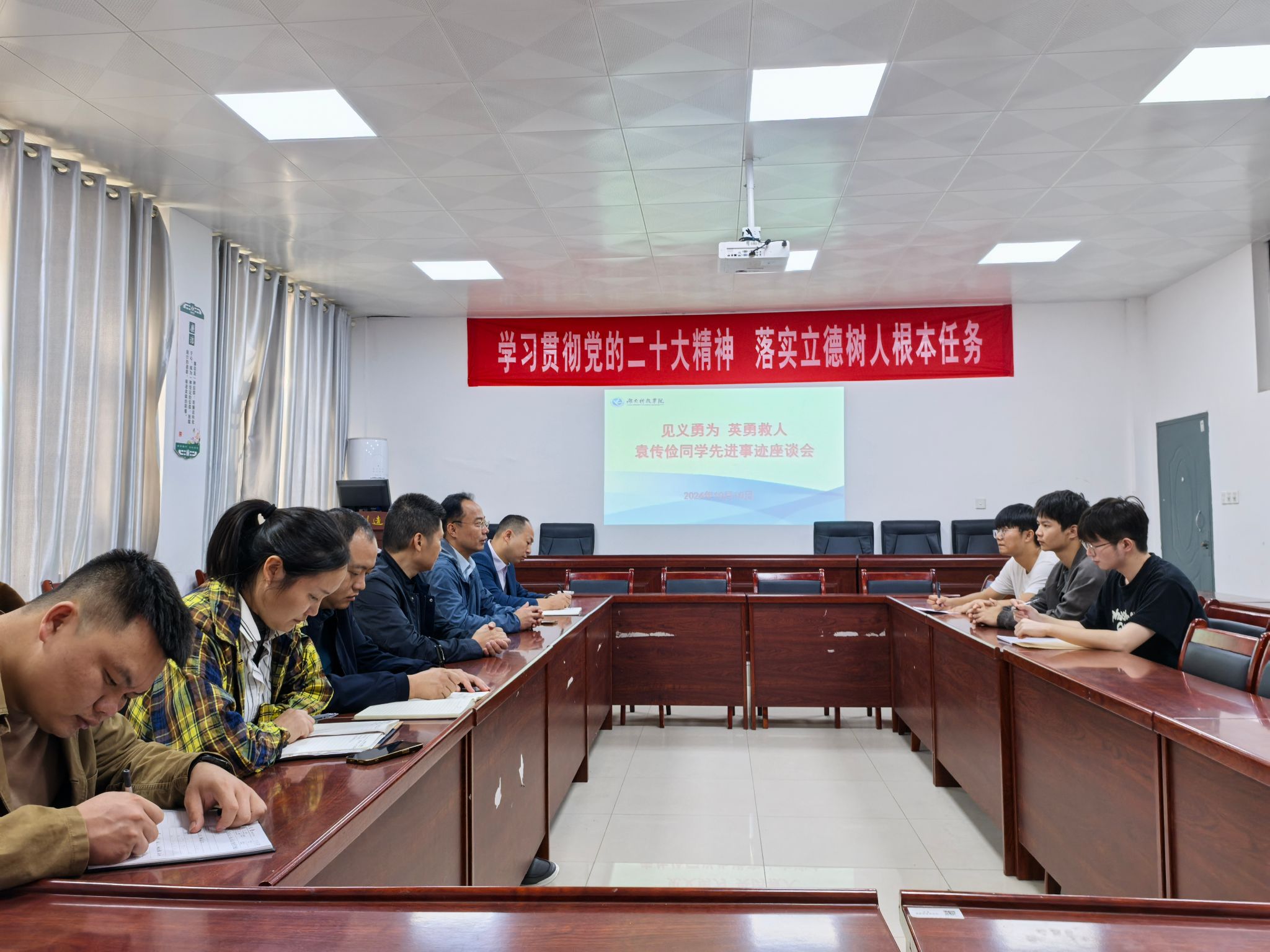 本网讯(通讯员 陈慧玲)10月10日,智能制造学院召开袁传俭同学先进事迹座谈会,该院领导班子成员、23级辅导员、班主任、袁传俭同学和各年级学生代表参加座谈会。
