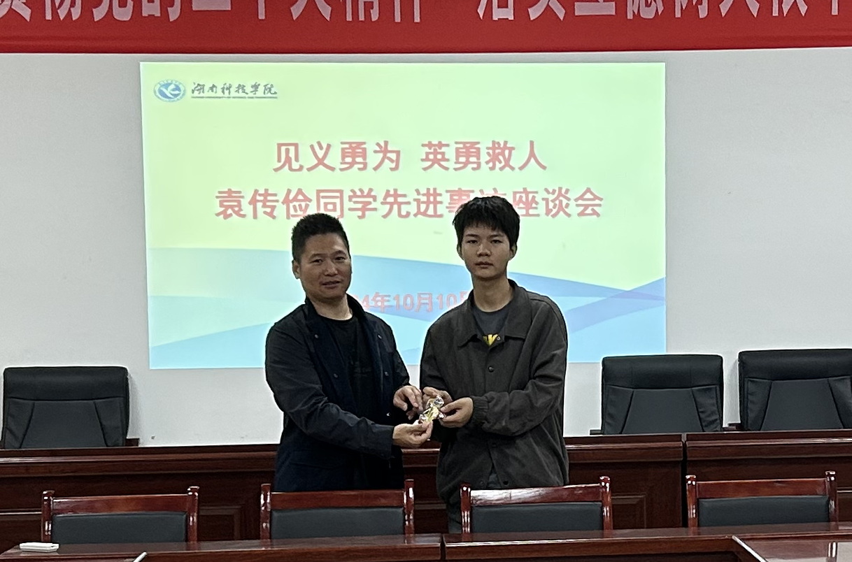 会上,学院党总支书记杨攀对袁传俭同学“见义勇为,英勇救人”的行为和事迹给予了高度赞扬,表扬他用实际行动诠释了当代大学生的责任与担任,为社会传递了正能量。院长谭永宏为袁传俭同学颁发纪念品,鼓励他继续努力,发扬好“德才兼备、自强不息”的校训精神。袁传俭同学感谢学校、学院和社会各界的赞誉,表示将继续弘扬见义勇为、乐于助人的精神,尽自己所能服务他人。