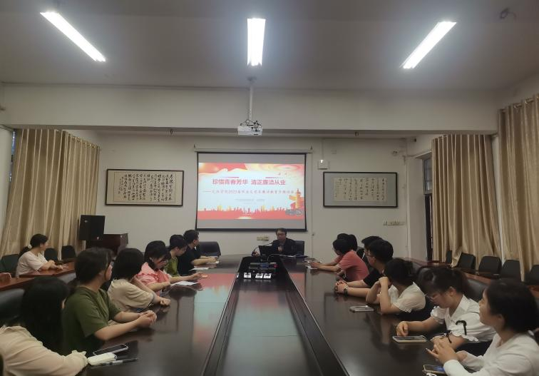本网讯 为增强毕业生党员政治意识、规矩意识和廉洁意识,2月25日下午,文法学院党总支在明德楼203会议室举办2022届毕业生党员廉洁教育主题党日活动,学院党总支书记谷显明作题为“珍惜青春芳华,清正廉洁从业”主题讲座。